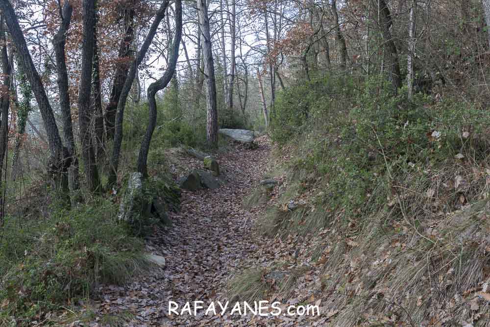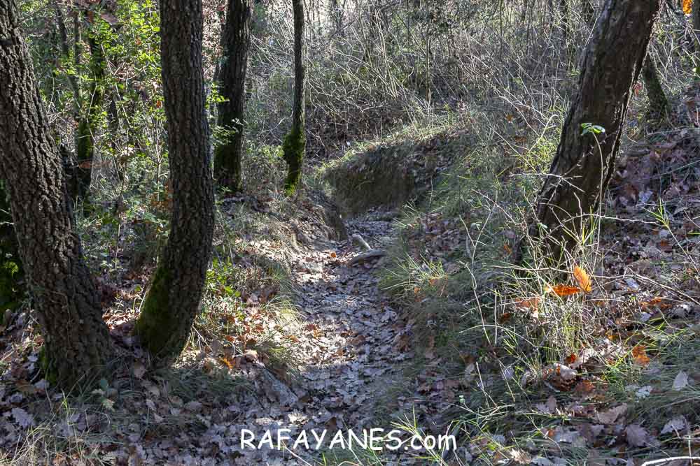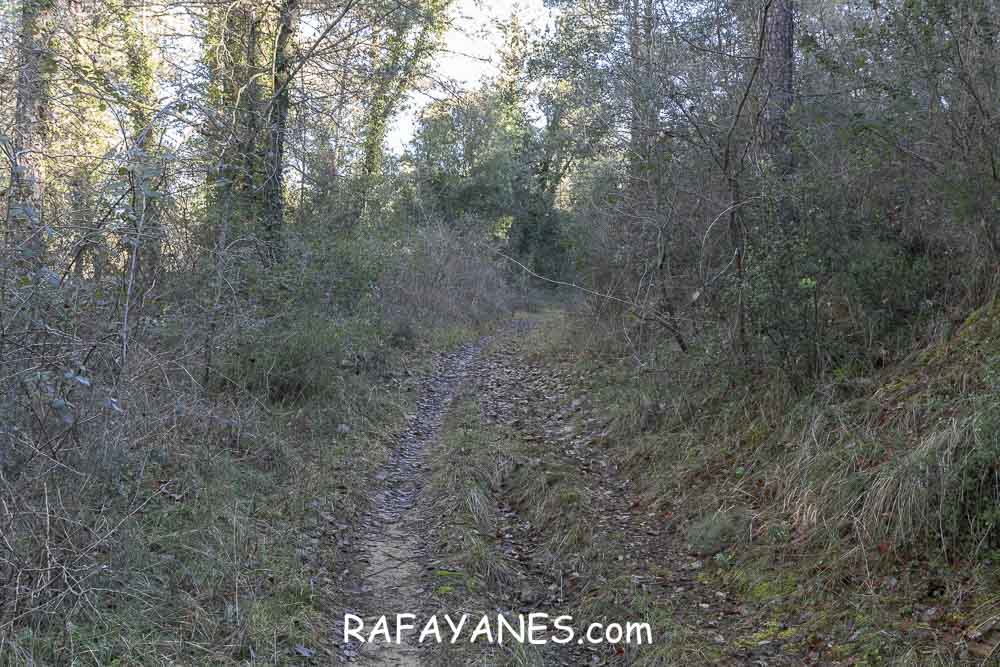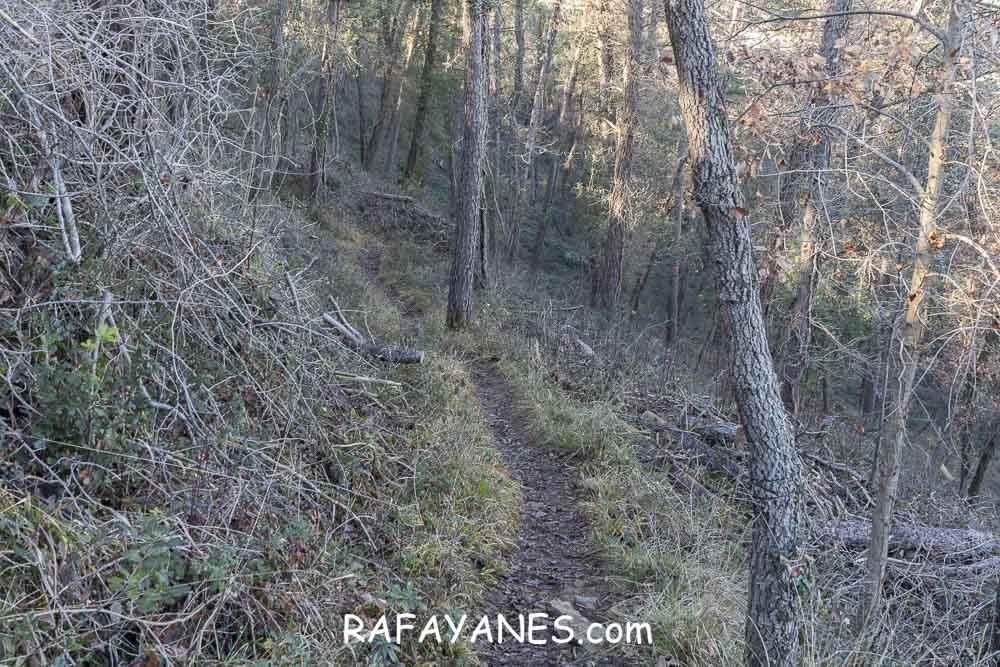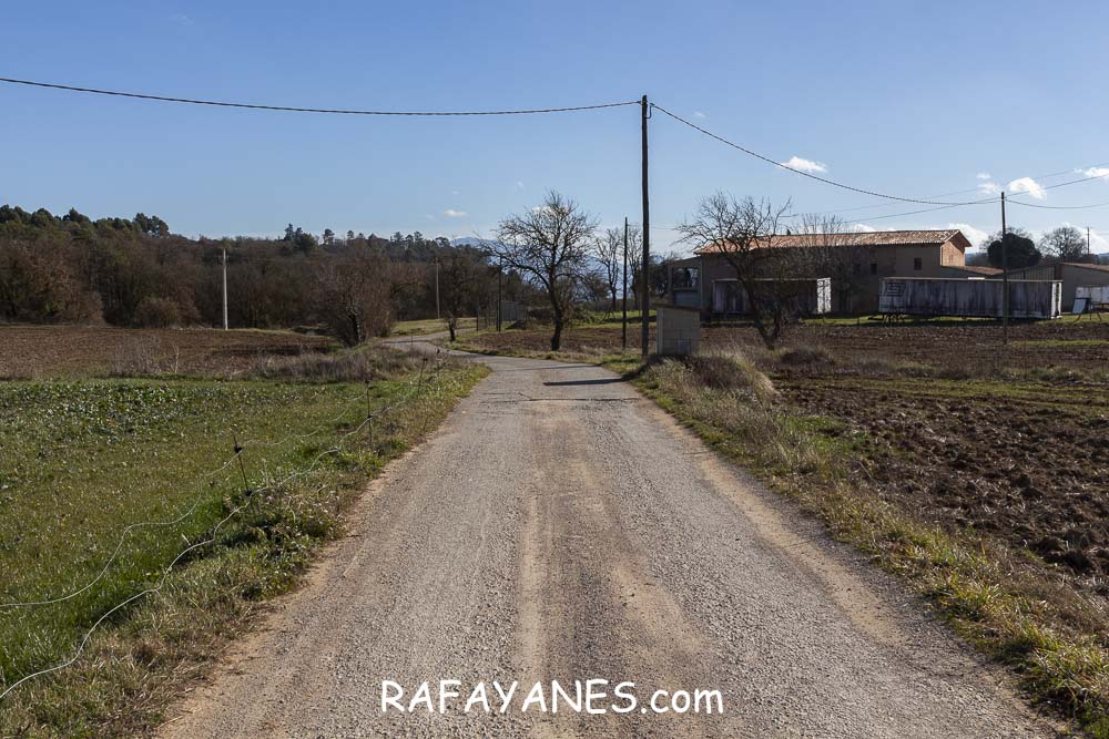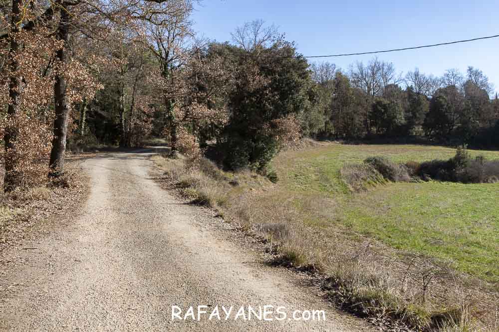 Llego a la base y me encuentro otro sendero resbaladizo hasta una pista entre masías.