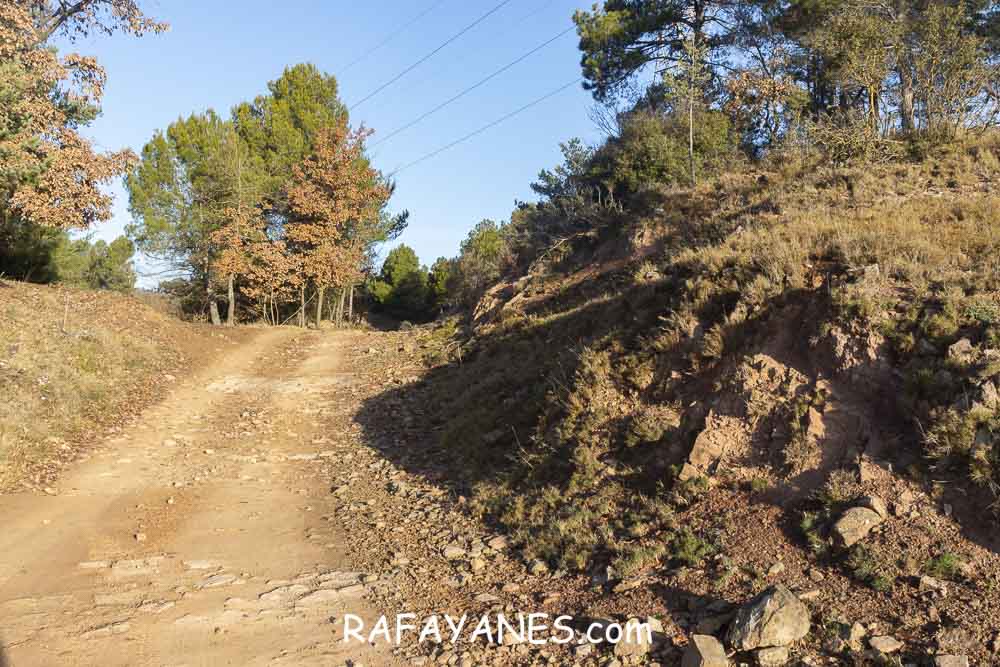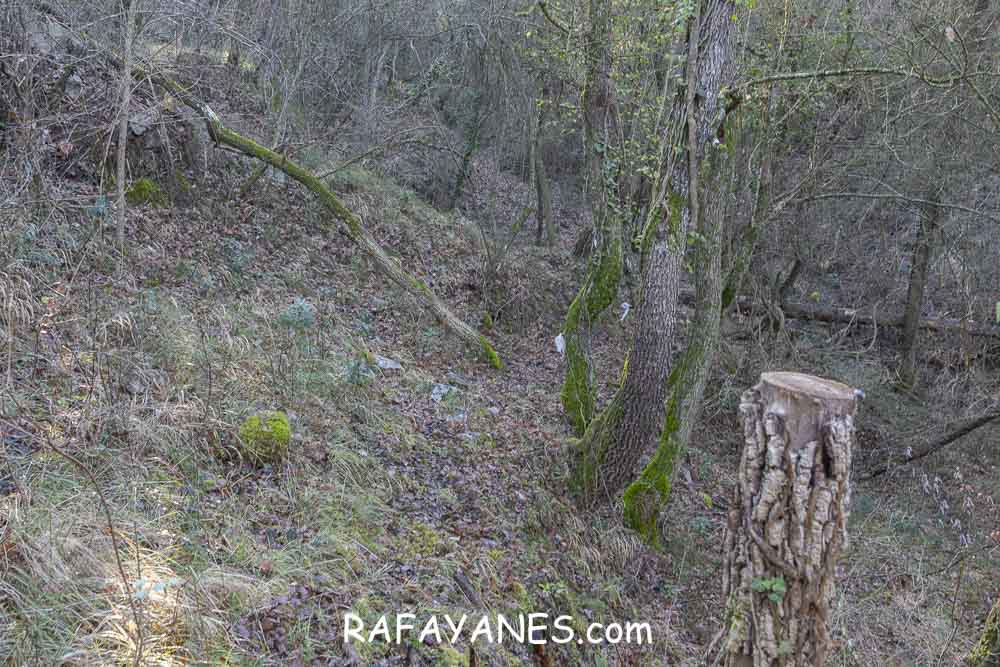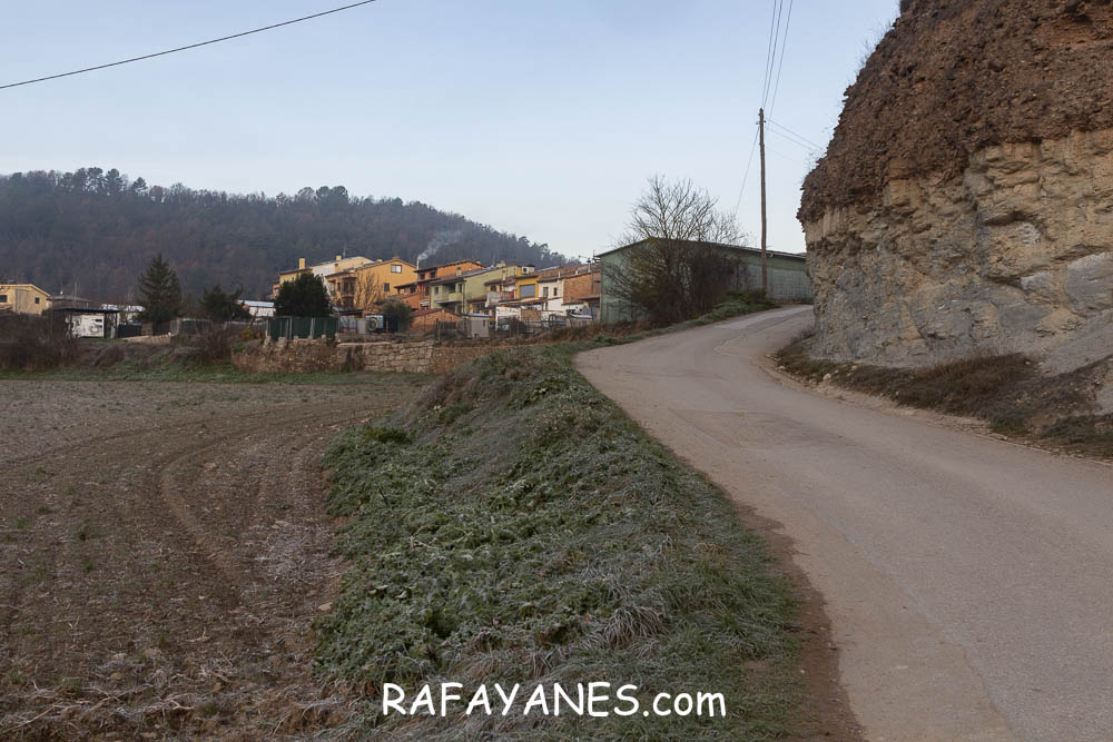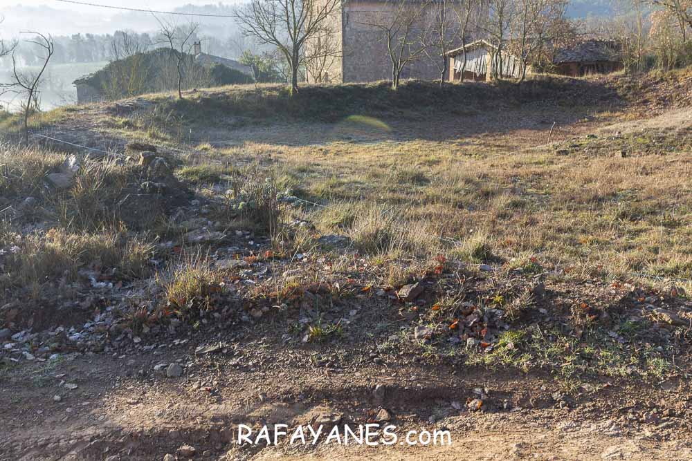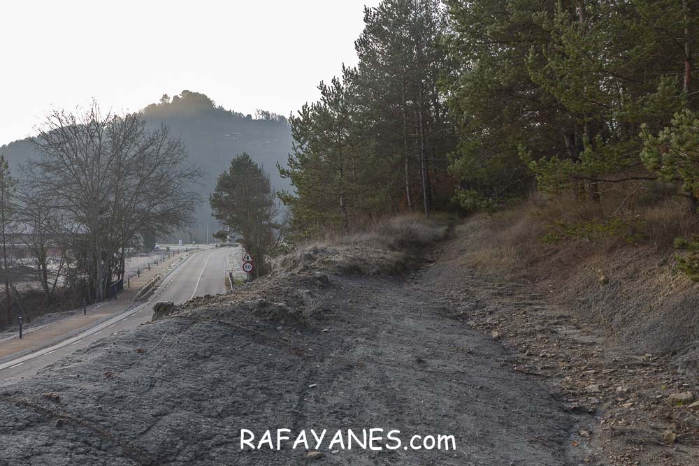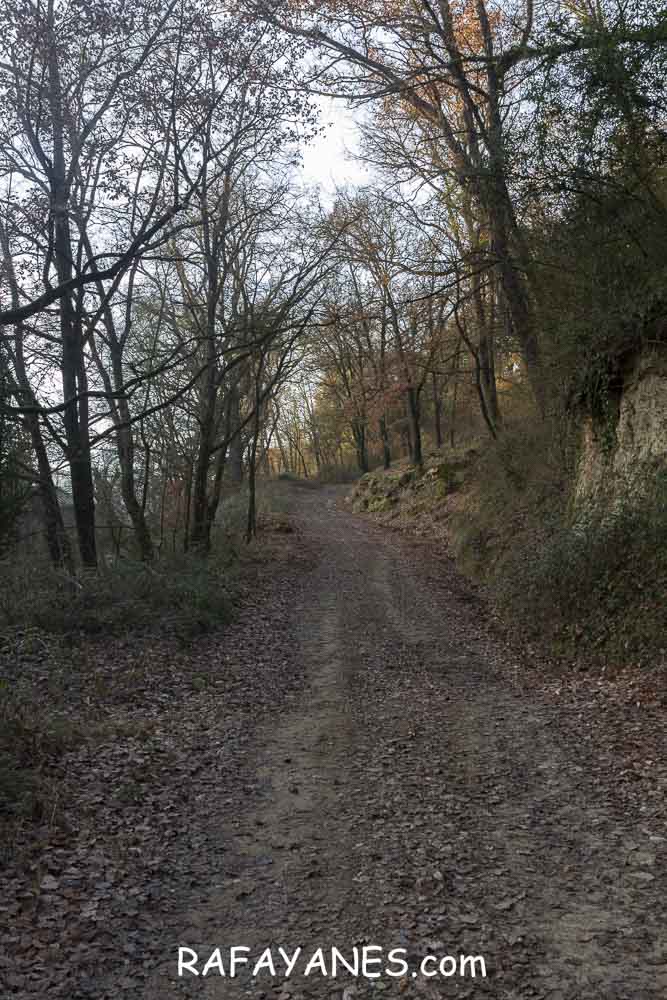 Llego a la base y me encuentro otro sendero resbaladizo hasta una pista entre masías.