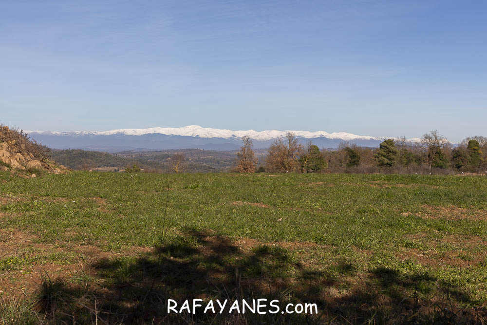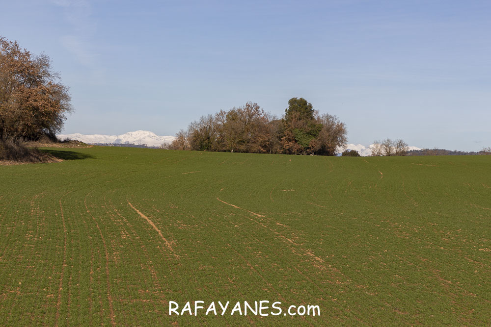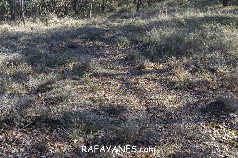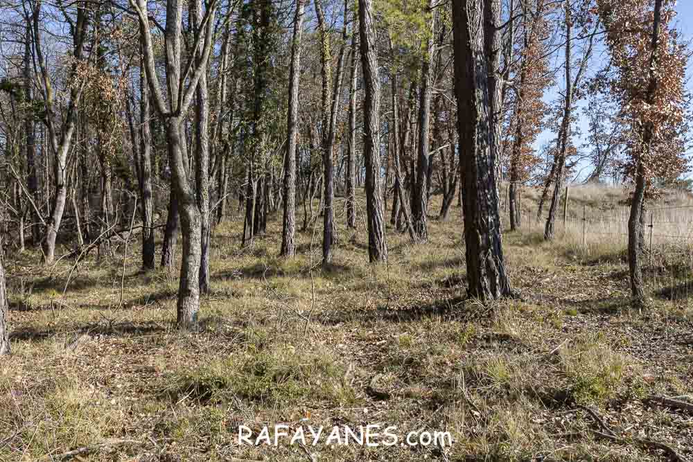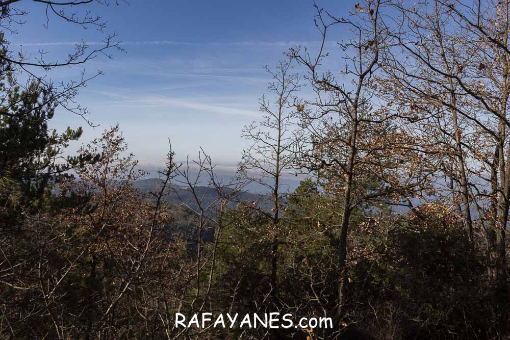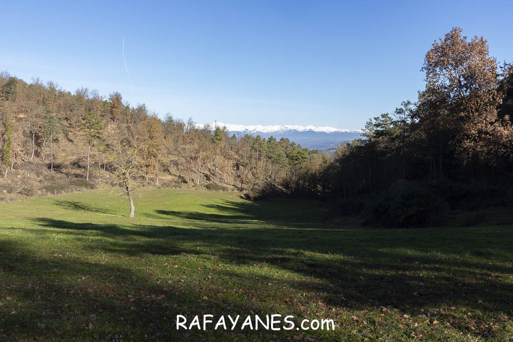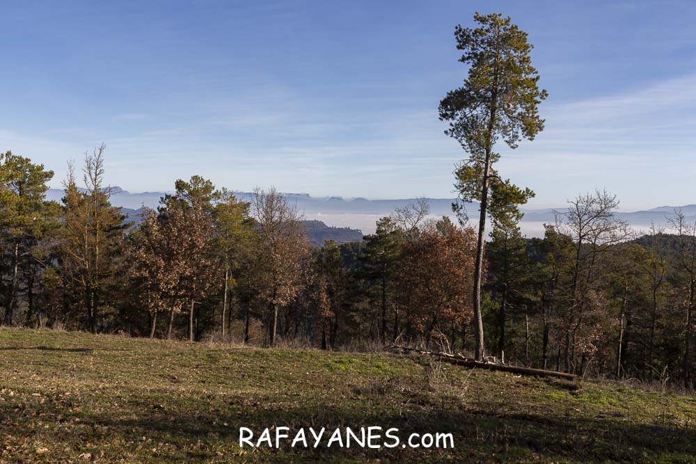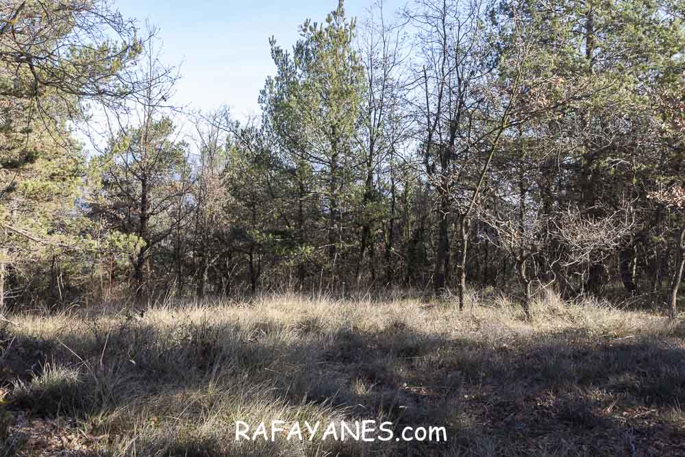 La vuelta por el mismo trozo de sendero que la ida hasta llegar a la bifurcación y girar a la izquierda. Durante un buen rato, voy por un sendero entre bosque poco tupido, llegando a ver el siguiente objetivo de hoy y los Pirineos nevados. Así hasta llegar a la pista.