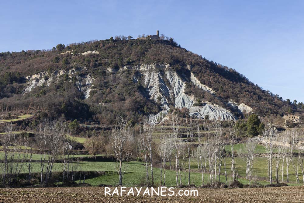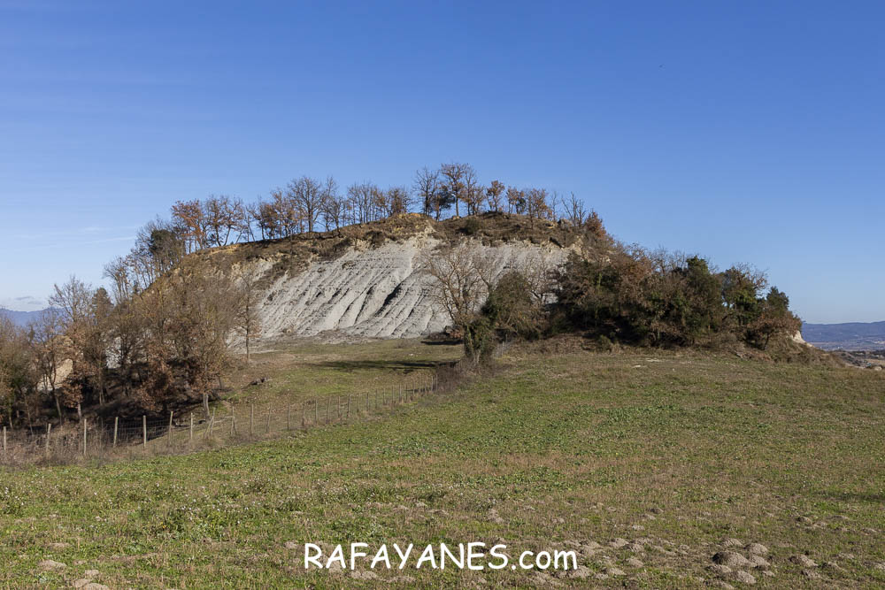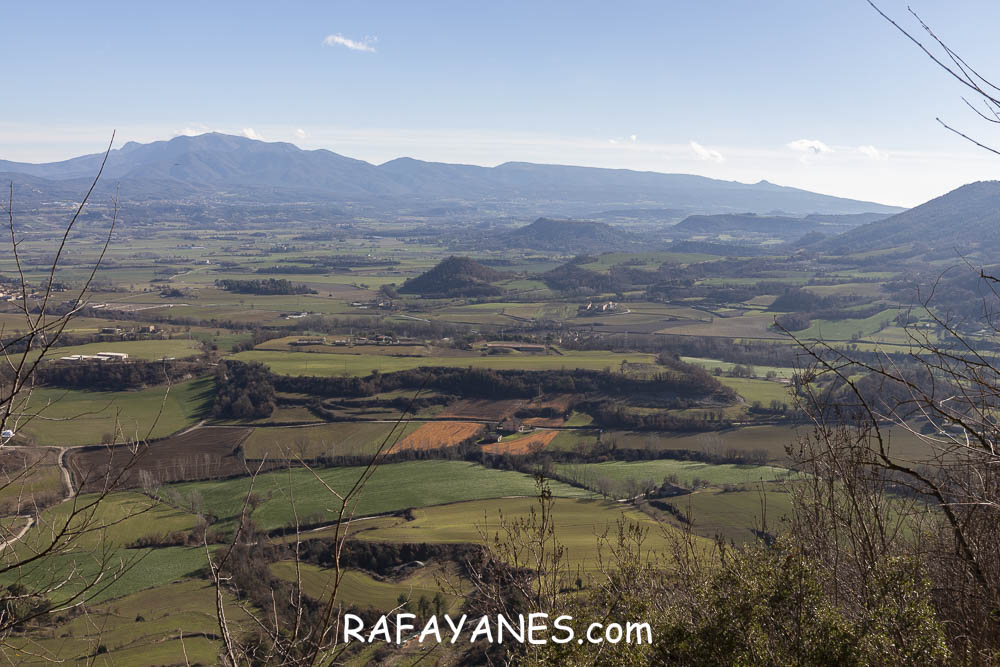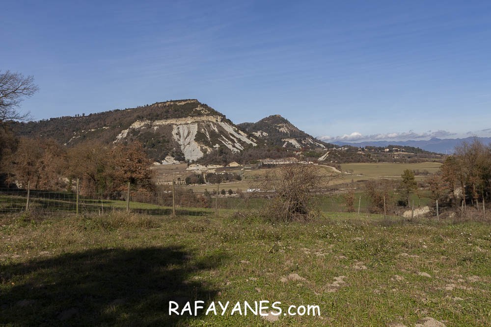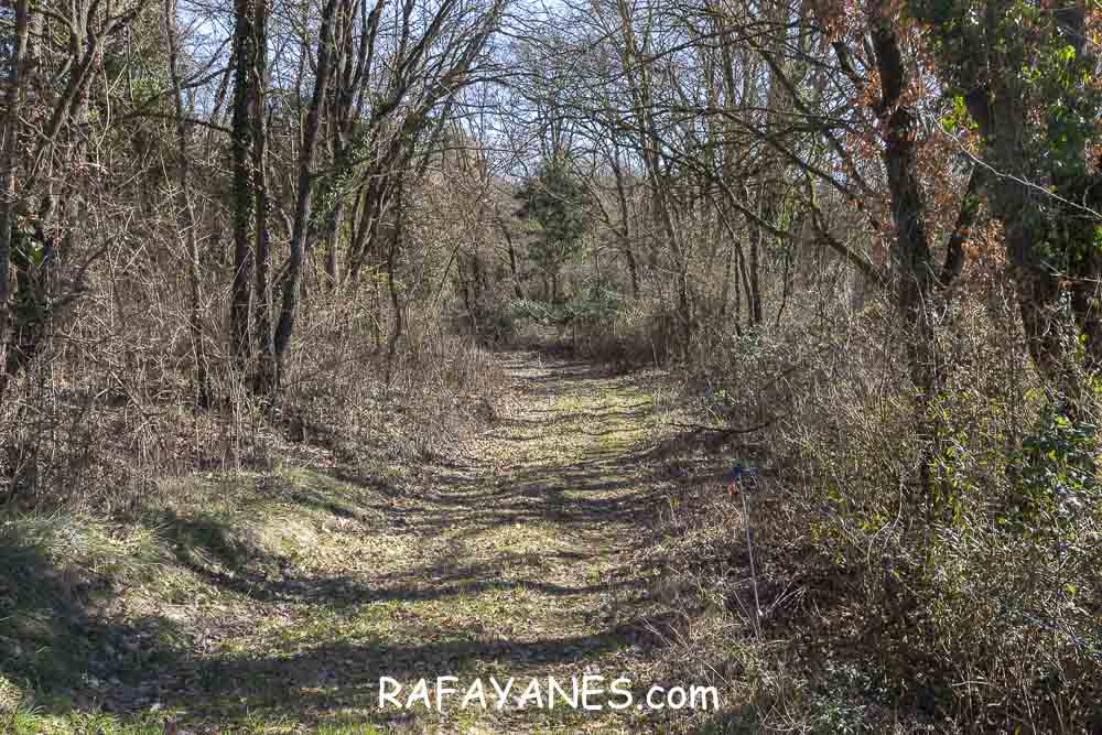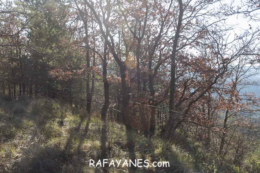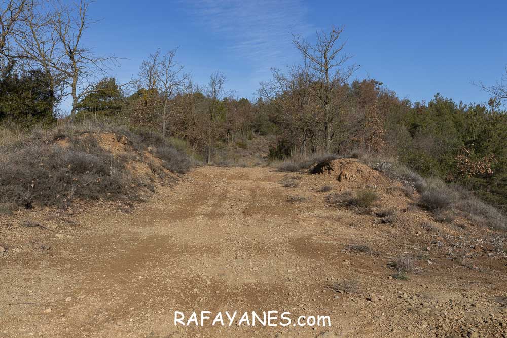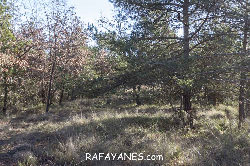 La vuelta por el mismo trozo de sendero que la ida hasta llegar a la bifurcación y girar a la izquierda. Durante un buen rato, voy por un sendero entre bosque poco tupido, llegando a ver el siguiente objetivo de hoy y los Pirineos nevados. Así hasta llegar a la pista.
