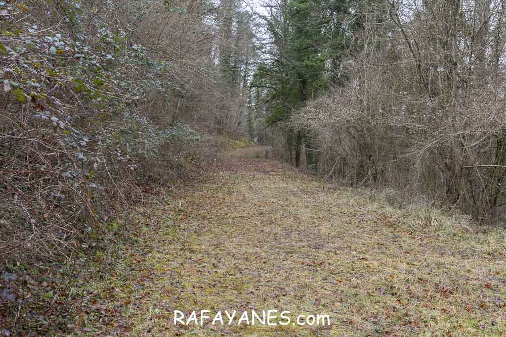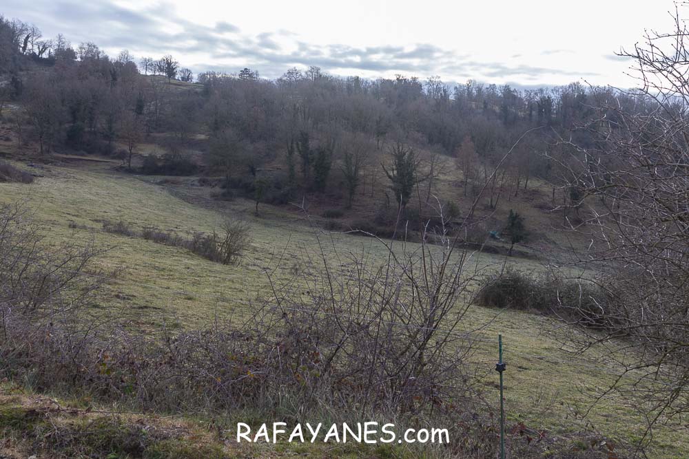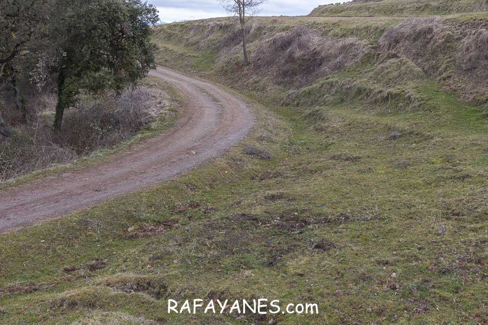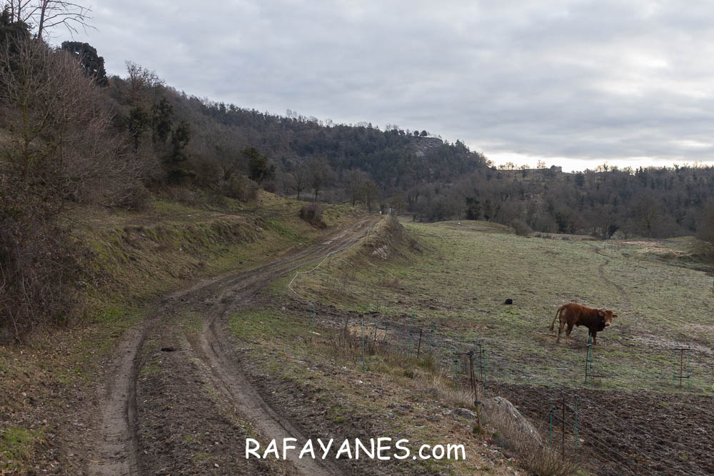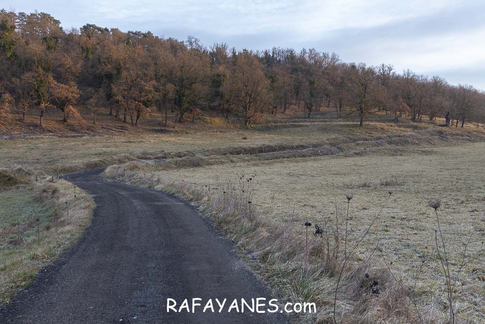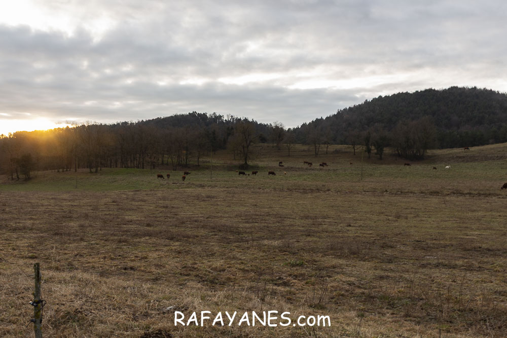 Durante un buen rato, voy andando por una zona que me sorprende por su tranquilidad. Combinando carretera hormigonada con tierra, y pasando por más explotaciones ganaderas, llego hasta un punto en la pista en la que me desvío a la izquierda por un sendero.