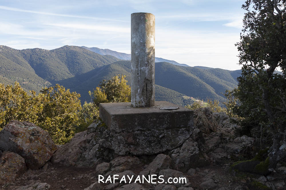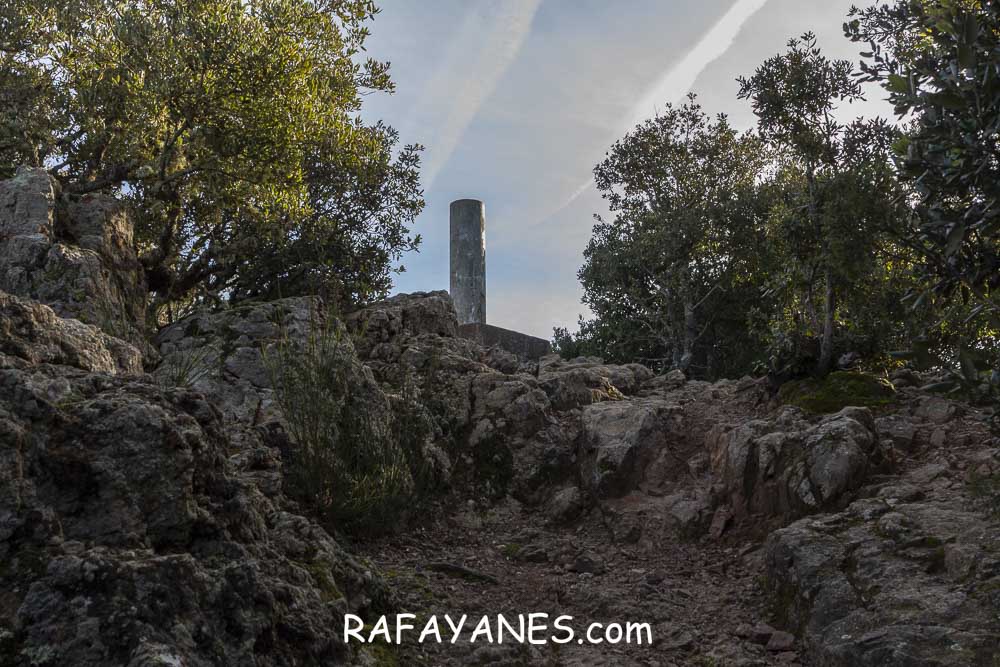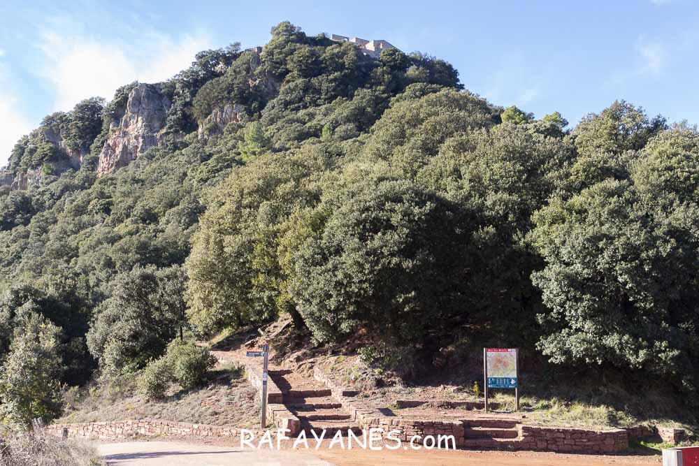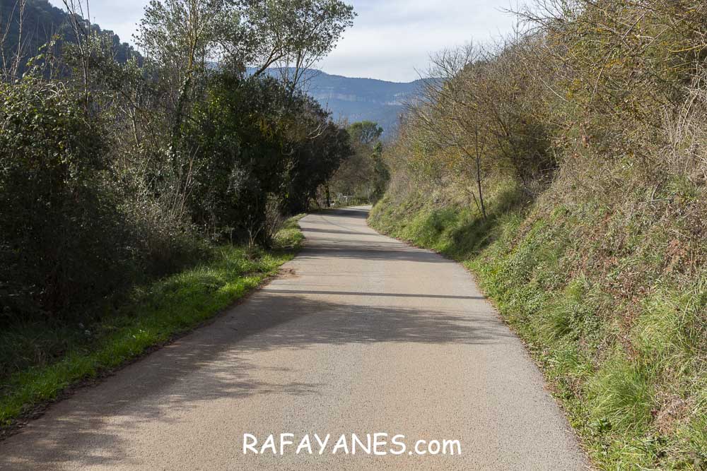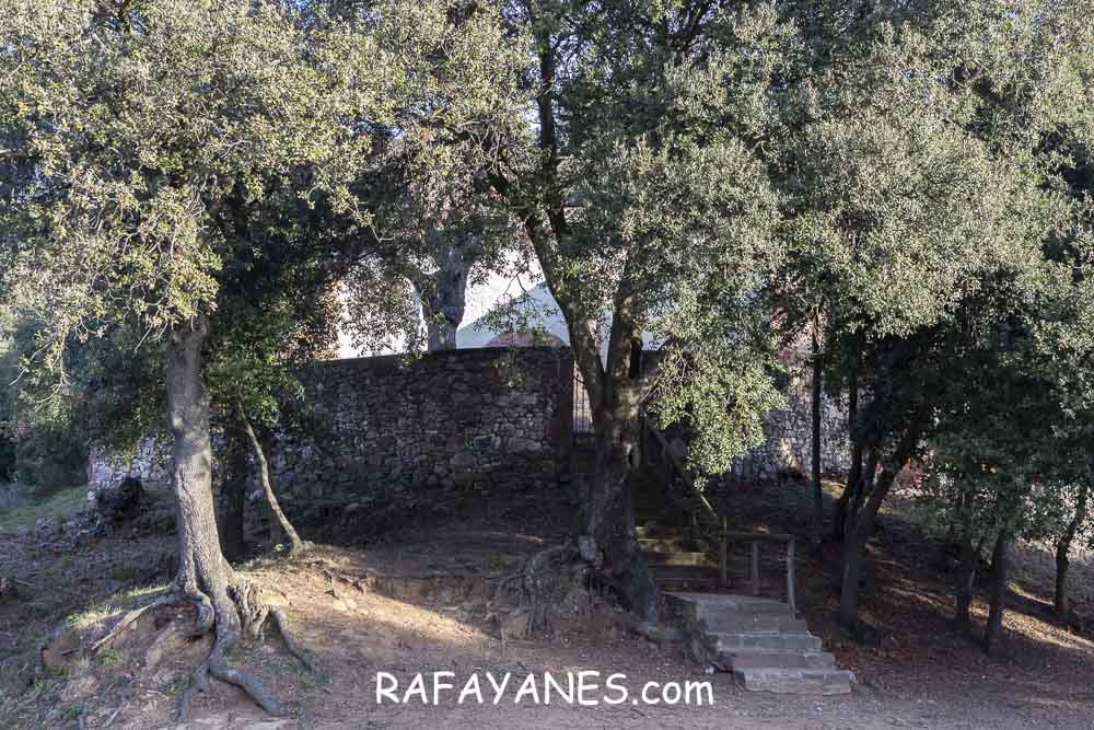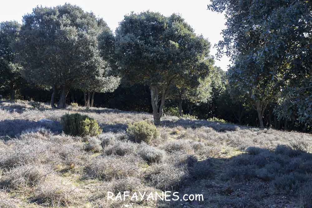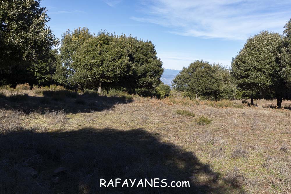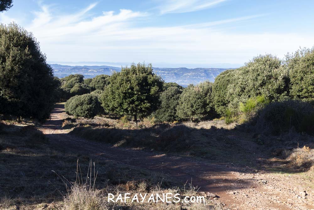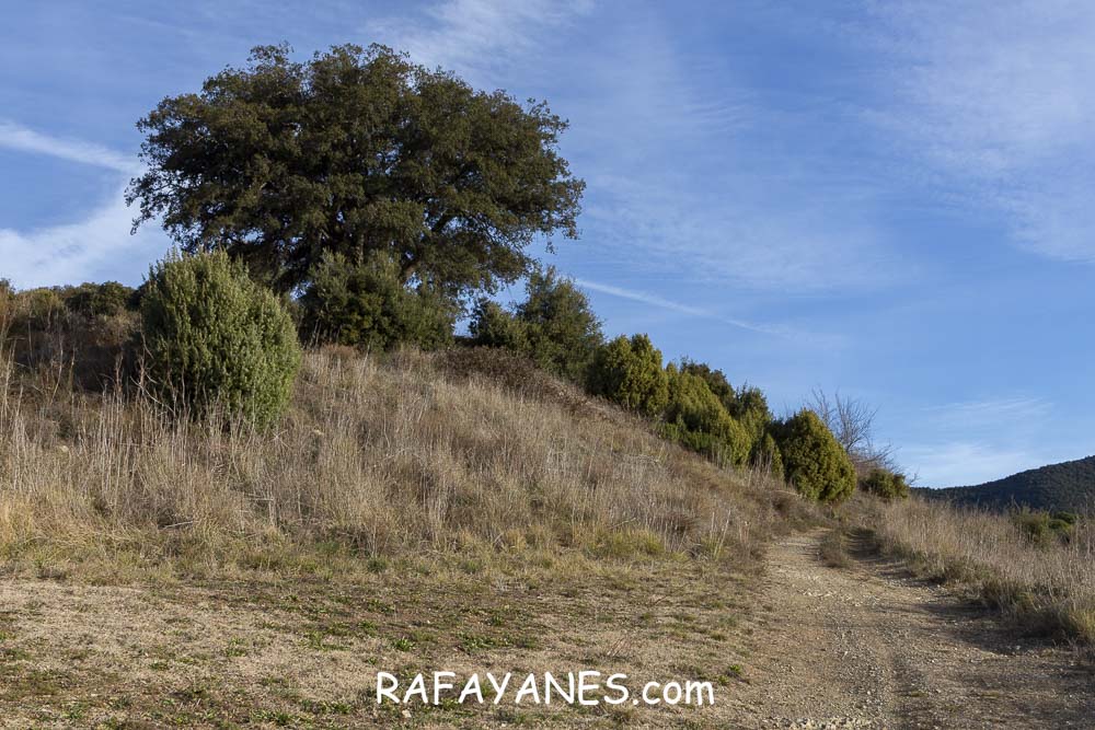 Sigo la pista que no me deja tregua en la subida, paso por la Ermita de Sant Cristófol de Monteugues, l’Encina de Can Valls y en el Pla de la Batalla, giro a la izquierda, dejando la pista y cogiendo un sendero más estrecho.