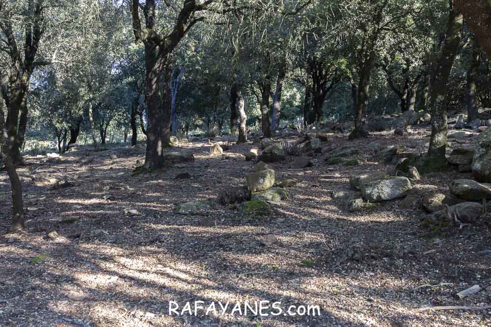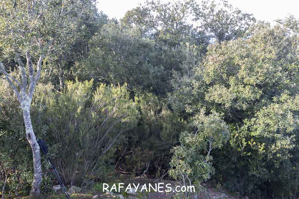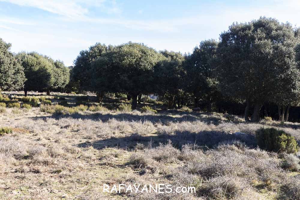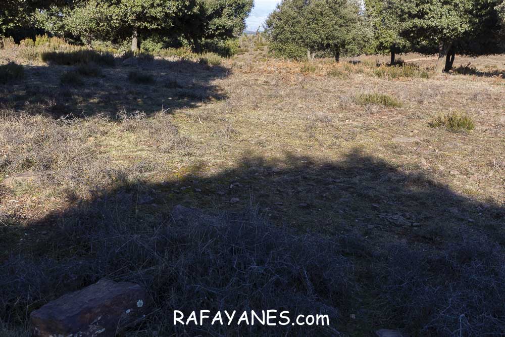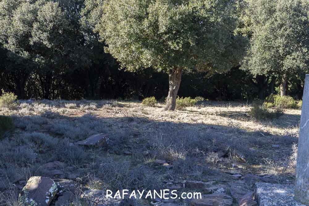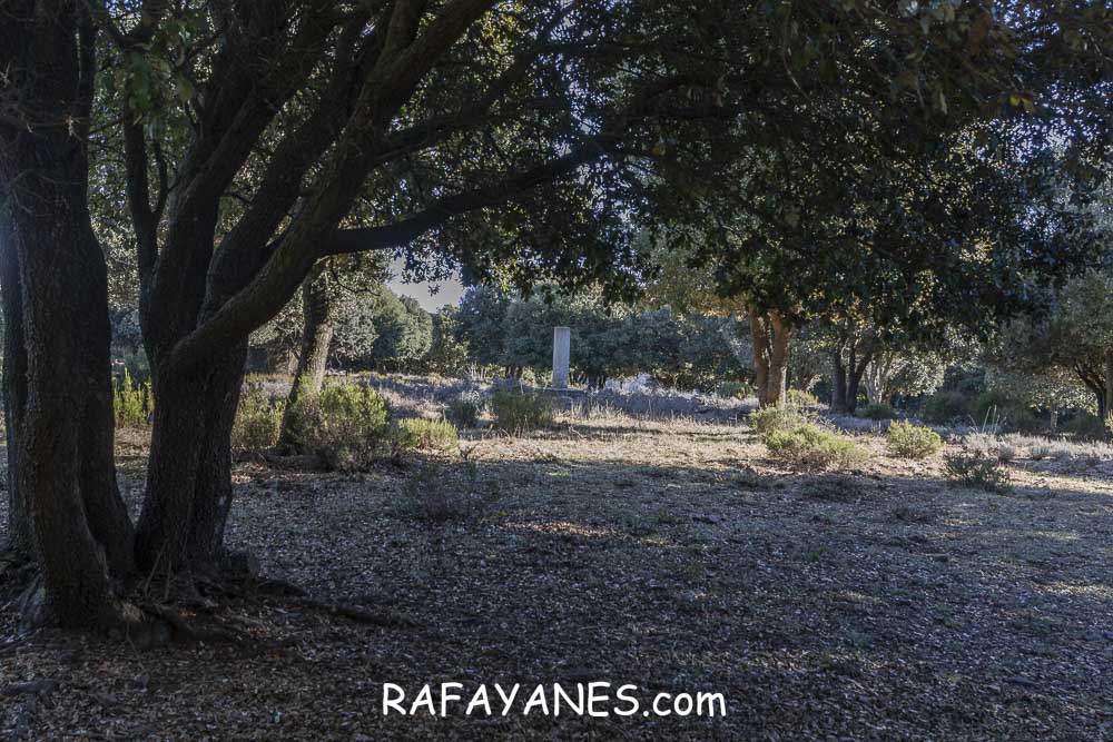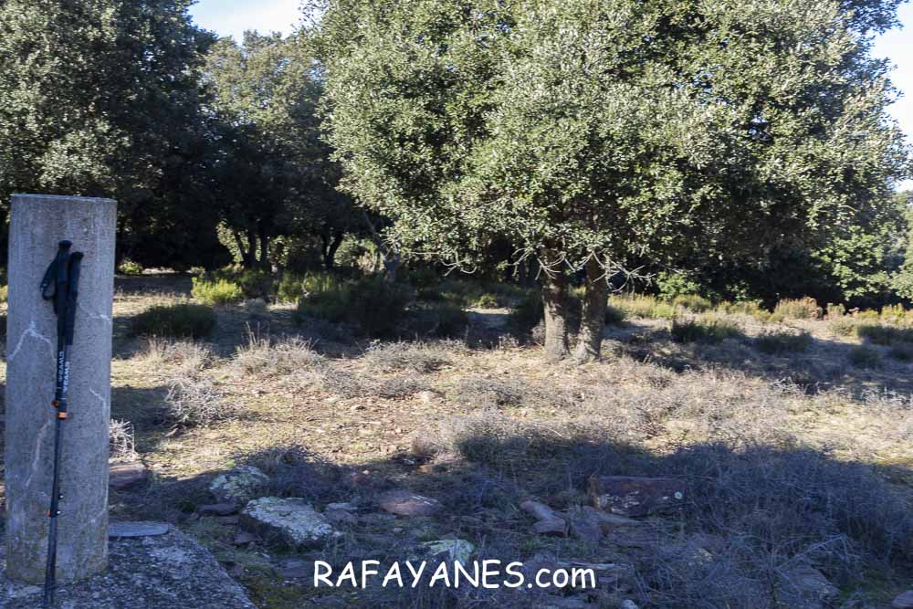 El vértice geodésico está situado en una zona muy plana y limpia de hierbas (supongo que unas cabras que estaban durmiendo allí tendrán la culpa) y con distanciadas encinas.
