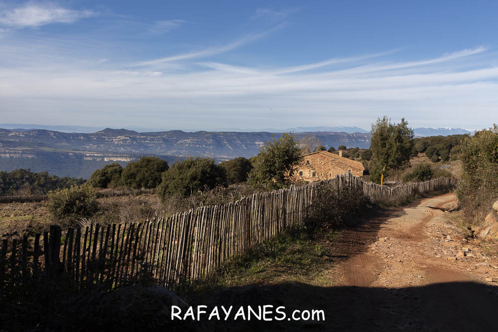 Empiezo a caminar por una pista de tierra ancha, pasando por pequeñas edificaciones. Al poco, la cosa ya empieza a “tomar forma” y empiezo a subir de forma ascendente. Entre pista y sendero llego hasta otra pista que recorreré durante un buen rato. Allí me encuentro la Creu de Can Plans.